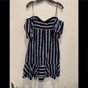 Concealed back zipper. - Gathered at bodice. WAYF Korbin Off-the-shoulder strapless mini dress Tiered ruffle sleeves and hem Cut out front Approximate flat Measurements Chest: 15.5” Waist: 14” Length: 27”
