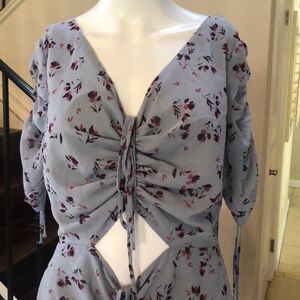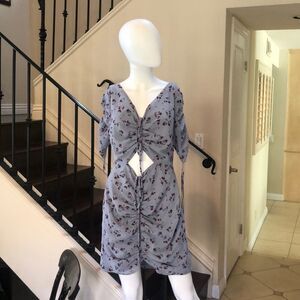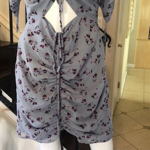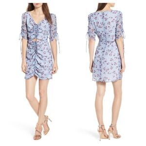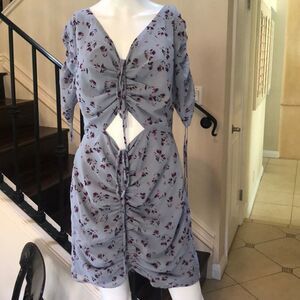 Ruched details and a peekaboo cutout add fresh, flirty style to this floral-print minidress. This style fits true to size (M=8-10).