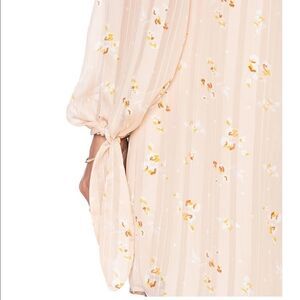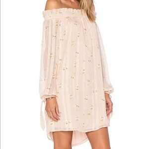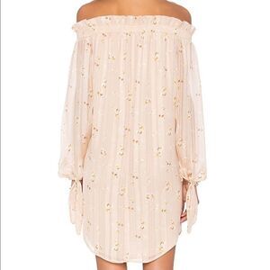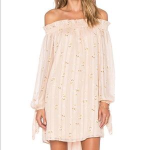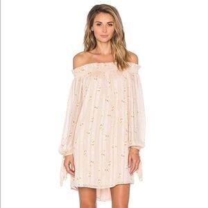 Adorable long sleeve off the shoulder dress by Wayf, size XS. This mini shift dress is fully lined, with perfect pink striped fabric and floral detail, it has a banded off the shoulder neckline and dainty ties at the cuffs. Not sure why the intense blacking out of the tag, but it’s in like new condition.