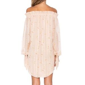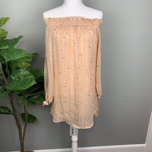 Blush colored with floral pattern. Off the shoulder. Elastic neckline so it’s easy to move around in! High/Low hem. Perfect preowned condition.