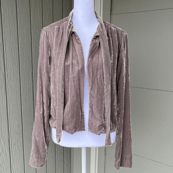 WAYF Taupe Crushed Velvet Tie-Neck Cropped Blouse Jacket Small