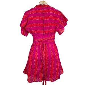 Pre-owned WAYWARD FANCIES Eshakti pink plunge linear graphic print cotton voile dress. Short sleeve mini dress with tie waist accent. Fully lined with zip back closure.