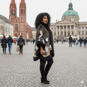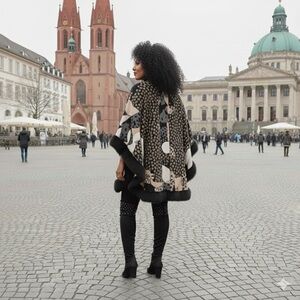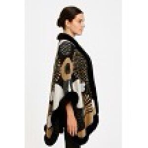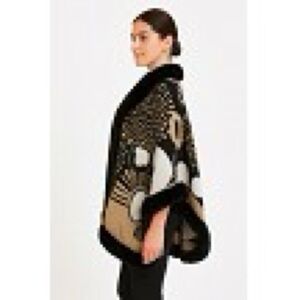 Make a bold entrance with the Abstract Print Faux Fur Trim Cape in Black & Camel — an artful layering piece that merges striking design with cozy sophistication. Featuring a unique abstract pattern in neutral tones, this cape is trimmed with plush black faux fur along the collar and edges for a luxurious finish. The open-front silhouette drapes effortlessly, offering comfort and warmth without sacrificing style. Perfect for elevating everyday outfits or completing an evening ensemble, this cape wrap is the definition of wearable statement art.