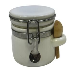 Mini Canister Spice Jars! A delightful set of six ceramic airtight spice jar canisters. Each jar measures 2.5"H x 2" in diameter and features a unique mini floral design, making them as beautiful as they are functional. Each of the canisters comes with its own wooden spoon tucked away in the side storage loop, perfect for scooping your favorite spices and herbs. Note-One rubber gasket is missing from one of the canisters-see photos to verify/determine details and condition. Keep your kitchen organized and stylish with these lovely spice jars. # 5494