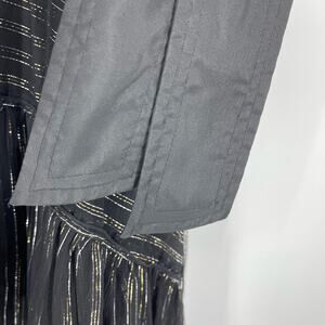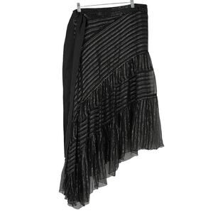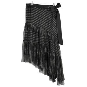 Very good condition, pre-owned, WD NY 100% Silk Black Silver Gold Stripe Tiered Skirt in Size 8. This is so cute. Tie waist. Beaded waist. Thin material blend. Will need to wear a slip or leggings under it. This is perfect for a party! See all pics and measurements.