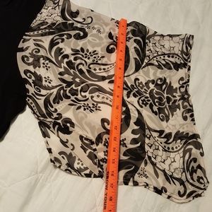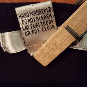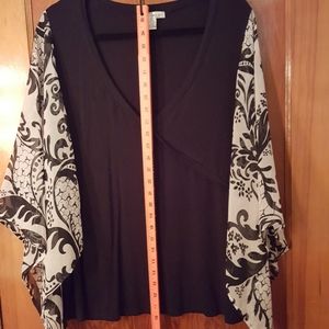 Black top with handkerchief sleeves, nice contour feature around the bust, small side slit, stretchy fabric for nice fit. Tag says wash by hand, but it's always been machine washed with no issues.