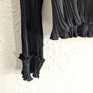 Black pleated, button down blouse with long sleeves and ruffle details. Perfect for any occasion.