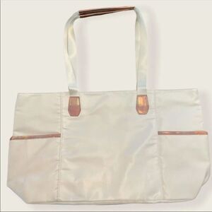 Carry all of your essentials in awesome Walt Disney World 50th anniversary tote. It is a cream color with "Walt Disney World" written out in a gradient. The WDW 50th logo is on the front of the bag in the same beautiful colors. There are 4 outer pockets on the tote- 2 on the front and 2 on the back.