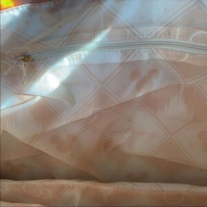 The interior is gold with a pattern of the 50th logo and Mickey icons. Top magnet button closure. There is one zippered pouch in the interior of the tote.