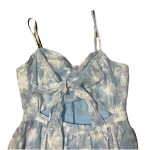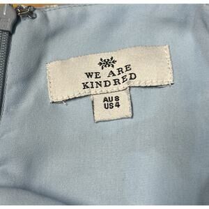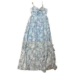 Dreamy and ultra-feminine We Are Kindred maxi dress in size 4. Soft blue floral chiffon with bow-tie bust, adjustable straps, asymmetrical ruched hem, and tassel tie details. Romantic and perfect for summer events, weddings, or date nights. Ideal for cottagecore, coquette, and coastal granddaughter aesthetics. Excellent pre-owned condition, no rips, holes, snags, pills or stains