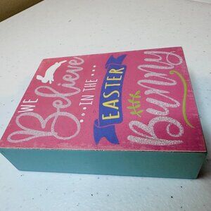 WE BELIEVE IN THE EASTER BUNNY wood block sign decoration glitter Easter decor