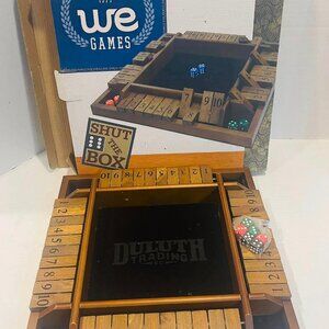 Enjoy hours of fun with the WE Games 4 Player Shut The Box (TM) Dice Game. This classic game is perfect for boys and girls, and can be played by a single player or a group of up to four players. The game is set in a walnut-stained wood box and features a choking hazard warning for small parts. The game includes dice, score pad and instructions to make it easy to start playing right away. It is a strategy game that is perfect for all ages and skill levels. The game is made by WE Games, a trusted brand in the game industry. Get ready for endless hours of entertainment with Shut the Box! Please check out pictures for further details. Great condition