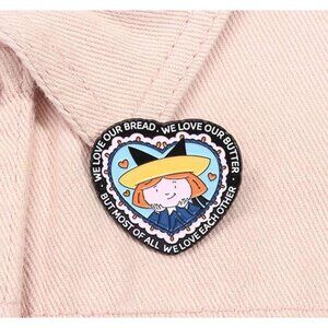 This charming heart-shaped Madeleine enamel pin is perfect for fans of "We Love Our Bread, We Love Our Butter." Its playful design adds a touch of nostalgia and whimsy to any outfit or accessory.