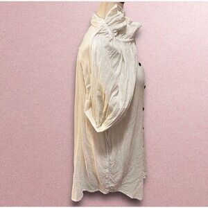 The "We The Free Button Down from Free People, White Crinkle Puff Long Sleeves with Ties" is a romantic and oversized tunic top for women. Made from 100% cotton, this white top features a collared neckline with a tie closure and puff sleeves, giving it a stylish and feminine look. The button accents add a touch of detail to this relaxed fit top, making it perfect for all seasons and various occasions, from hipster to beachy to fairy-inspired themes. Easy to care for with machine washable fabric, this top is a versatile and stylish addition to any wardrobe. Rounded shirt bottom.