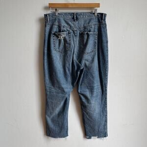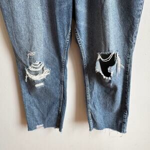 Details: WE THE FREE CRVY Georgine heavily distressed cropped jeans in medium washed with distressing on the thighs, knees, pockets, and at one belt loop, a raw hem, and a tapered leg.