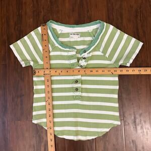 The WE THE FREE Petal Pusher Tee Top in green striped is a stylish and comfortable addition to any woman's wardrobe. This cropped top features a Henley neckline with a button closure, perfect for a casual or travel outfit. Made from a breathable knit fabric blend of spandex and cotton, this top is stretchy and comfortable, especially for summer, fall, and spring seasons. With a modern and hippie theme, this top from We The Free is a trendy and versatile choice for everyday wear.