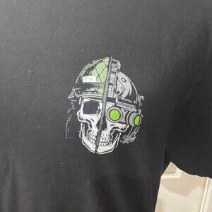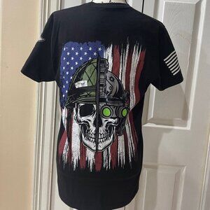 This men's medium-sized t-shirt boasts a striking graphic design featuring a skull with a tactical helmet, superimposed on an American flag motif with a distressed effect, capturing a patriotic and powerful spirit. Crafted from a high-quality, breathable fabric blend, this tee offers both comfort and durability. The black backdrop highlights the graphic's intricate details, from the vibrant hues of the flag to the striking green night-vision goggles on the skull. The shirt also features a comfortable ribbed crew neckline and short sleeves perfect for any casual setting. Designed with a regular fit, this t-shirt is the perfect choice for anyone looking to showcase their love for edgy, statement-making apparel while paying homage to timeless American themes.