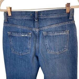 Distressed lightly with shark bite hem, button fly 9.5” high rise, ankle-length straight-leg jeans cut from nonstretch denim.