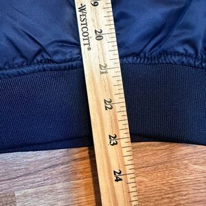 Jacket is blue, has a zipper pocket on the arm. Has front pockets, no hood. Full Zip. Silver Seahawks pattern all over the inside. Body made with nylon, lining made with polyester. Rib made with polyester and spandex. Machne washable. On the back of the jacket the coordinates for Lumen Field are embroidered on with green. Length 23 inches, Chest from pit to pit 24 inchesPre-Owned-Excellent condition.