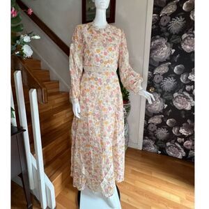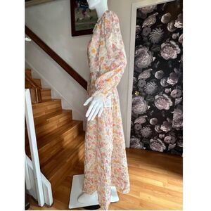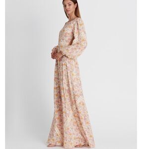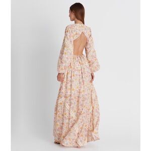 Orange cotton Pia cut-out floral print maxi dress from WE ARE KINDRED featuring round neck, long puff sleeves, belted waist, flared design and back cut-out detail.