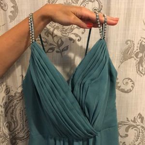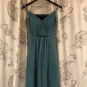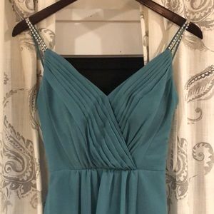 The color is Teal Blue from David’s bridal. The dress is a size 0 and has been taken in more.