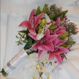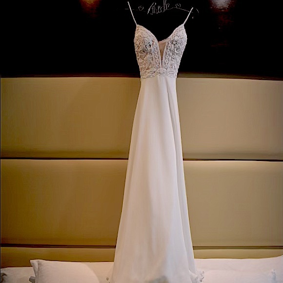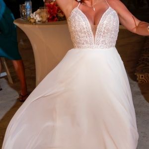 Wedding dress, professionally cleaned and boxed. Open back. High slit both sides. Deep V neckline. Originally $2000. Lightweight material, beautiful lace design on top, each slit outlined in lace. Hidden zipper with buttons detailing at low back. Bustle. Will sell the bouquet also for an additional $50. I am 5’2” and was between 130-145 pounds. The dress is long and will fit someone taller. Nothing was spilled on the dress.