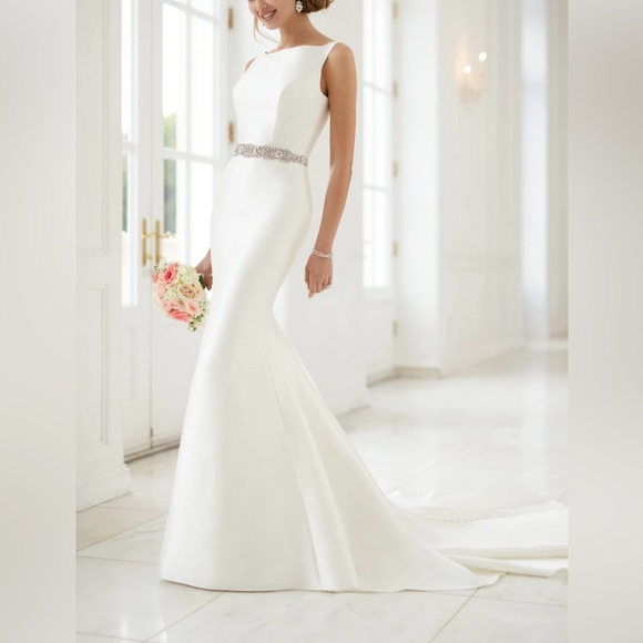 Simple and elegant describe this classic mikado fit and flare wedding dress. Featuring a flattering sweetheart neckline, princess seams down the bodice with an elongated dropped waist and flared trumpet skirt. A beaded crystal belt sits at the natural waist and covered buttons down the center of the chapel train finish the look.