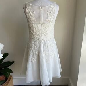 Ivory lace and tulle short A line wedding dress from David's Bridal. Hits above the knee, sweetheart bodice with mesh scoop neckline.