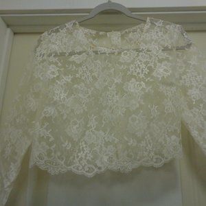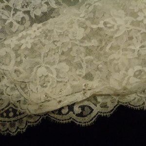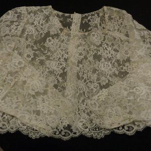 THIS IS A BEAUTIFUL PIECE. ON LIGHT BACKGROUND IT LOOKS MORE WHITE. ON THE DARKER BACKGROUND IT LOOKS MORE CREAM. UNDER LIGHT IT IS MORE WHITE. IT IS A VINTAGE PIECE. THERE ARE NO TAGS. IT IS A SYNTHETIC. SEE THRU LACE. WITH LITTLE SNAPS ON THE OLD FASHIONED SLEEVES AND IN THE BACK. FROM UNDERARM TO UNDERARM ALL THE WAY AROUND THE PIECE IS 41 TO 42 INCHES. YOU COULD WEAR OVER A GOWN OR BLOUSE OR CAMISOLE. ENJOY PRETTY THINGS. WITH LIGHT WEAR YET PLENTY TO SHARE WITH YOU LUCKY BUYER . ENJOY THE PAST. 2ND GROUP. THANKS