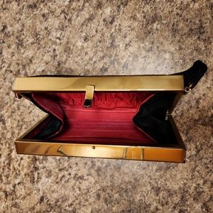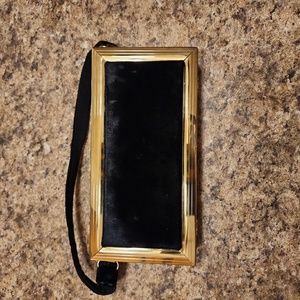 What's a shoe if you don't have the purse to match? you MUST coordinate..wel I have here the perfect marriage..This black velvet wedge bootie with golden mirror plates attached to the sides is an eye-catcher, and the small black velvet clutch with the golden mirror trim is the perfect accessory..the bootie zips up on the side and has a heel height of 3 inch..put this cute set in your collection today..