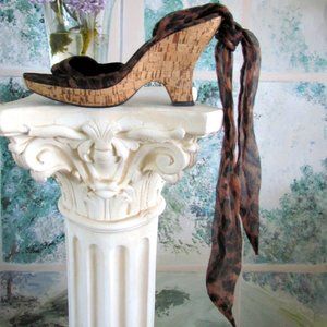 By Nine West, these are unique with their long, leopard fabric ankle straps that crisscross around your ankle and up your leg. They have a charming curve to the heel and a platform which resembles cork. All the materials are manmade.