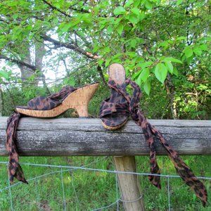 WEDGE SANDALS, 8.5 -9 M, LEOPARD CRISSCROSS ANKLE STRAPS, CURVY PLATFORMS