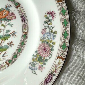 This elegant Wedgwood “Kutani Crane” dinner plate showcases one of Wedgwood’s most beloved and enduring patterns. Crafted in fine bone china, the plate features a central motif of graceful cranes among blooming peonies and bamboo, accented by flowing water. The rim is beautifully decorated with multicolor floral sprays and geometric bands in green, rust, and lilac tones, all set against a crisp white background. In many Asian cultures, the crane is associated with longevity, good fortune, and prosperity, making Kutani Crane a pattern highly sought after for its elegance and meaningful symbolism! A timeless piece that combines artistry and heritage, this plate is perfect for collectors, elegant dining, or display.