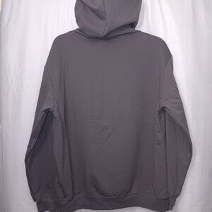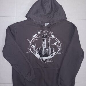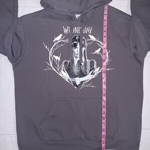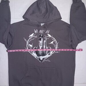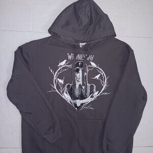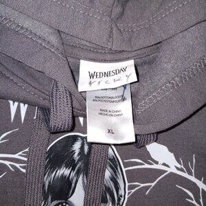 Size XL Women's Wednesday Adams Family graphic pullover sweatshirt hoodie has functional hood drawstring and functional kangaroo pocket in a gray multi color the material is 60% cotton and 40% polyester in good pre-owned condition. Note previous owner name is on tag as seen in photos
