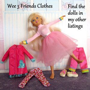 Here is another collection of the "Wee 3 Friends" clothes plus a foofy pink vintage tutu skirt. See all of the photos for everything that's included. Stacie is only modeling here, but find her as well as her girlfriends, Lila and Janet, in other listings of mine -- plus more outfits, and more to come!