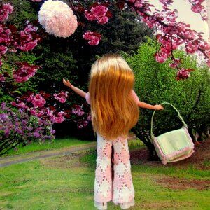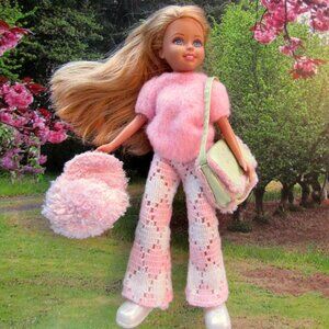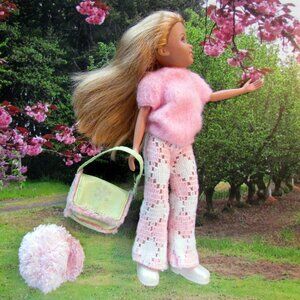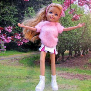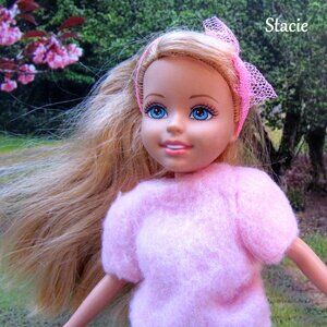 Here is the blonde doll, Stacie, of the trio, "Wee 3 Friends" by Mattel. Made from 2004 to 2008, these girlfriends have the sweetest faces. See all the pictures for everything that's included: vintage pink fuzzy sweater and sweater pants, fuzzy pink visor hat, original white boots, a "cheerleader" silver mini skirt with hot pink pleat inserts, and a cool pink and mint green bag with a surprise in it! I've added the tulle headband. Check back for more of these dolls and separate outfits.