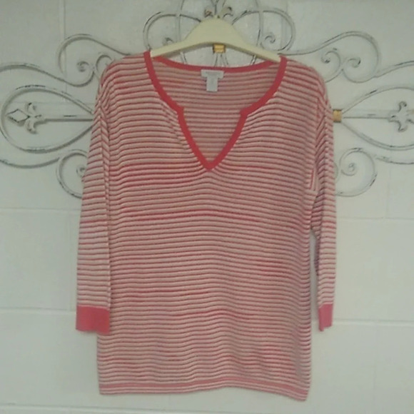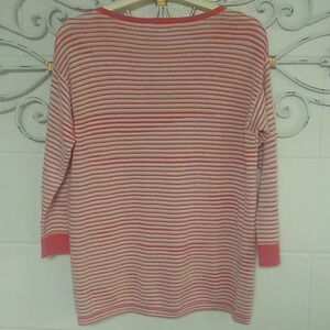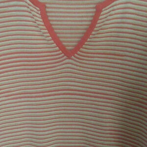 CORAL KHAKI & WHITE GIVE THIS LIGHT WEIGHT SWEATER A WALK ON THE BEACH VIBE. PUT ON YOUR KHAKI CLAMDIGGERS & SPERRY'S & YOU'RE CASUALLY, SOPHISTICATED FOR THE DAY.