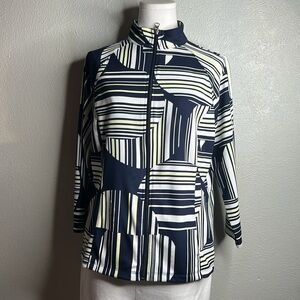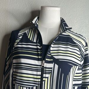 WEEKENDS By Chico’s Navy & White Linear Dot Striped Geometric Print Knit Wrinkle Free Zip Up Front Jacket Sz Medium . Chico’s size 1 or 8 / medium . See size chart above. . 100% polyester. Excellent condition. Stylish navy, neon lemon yellow and white striped jacket perfect for any occasion. Lightweight and comfortable, ideal for layering. Has pockets . Elevate your wardrobe with this versatile piece. Beautiful mix & match must have Chico’s jacket .