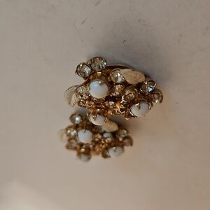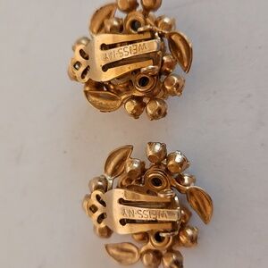 WEISS NY Vintage Milk Glass, Enamel & Rhinestones on goldtone Clip On Earrings. The leaves are white enameled, there are a few wear spots as seen in the photos. The intricate design showcases sparkling stones that catch the light beautifully.
