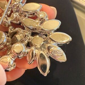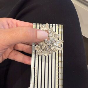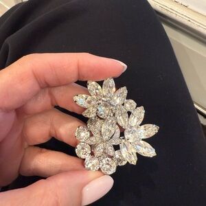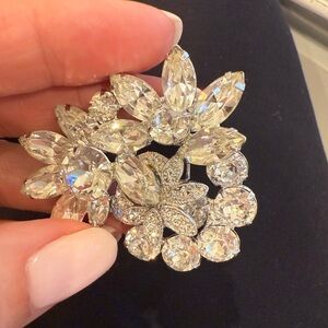 This exquisite brooch features a floral-inspired design with clear crystals set in a silver metal setting. The asymmetrical arrangement of stones creates a dimensional, layered look that captures and reflects light beautifully. Perfect for adding a touch of vintage elegance to any outfit.