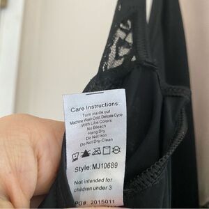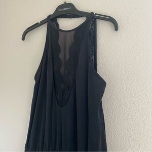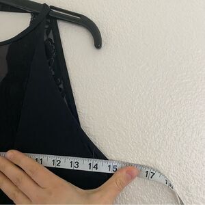 Halter neck has G-hook closure in back and stretch lace over skinny straps