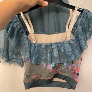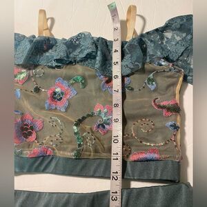 Crop top is floral sequin embroidered mesh over shiny spandex