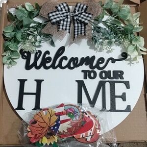 WELCOME TO OUR HOME White Round Interchangeable Wooden Sign Hanging Placard Doorknocker Welcome Sign Size 12"x12" NWT