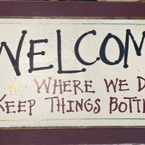 WELCOME Where We Don't Keep Things Bottled Up Wood Sign-5 ½" X 12" Hand Painted