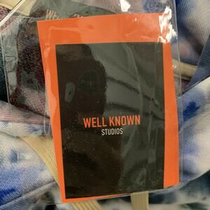WELL KNOWN STUDIOS "Houston" hooded sweatshirt in blue and black tie dye featuring metal logo hardware plaque at center front, frontal pockets and hood, drawstring and "Well Known" logo at center back.