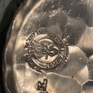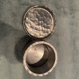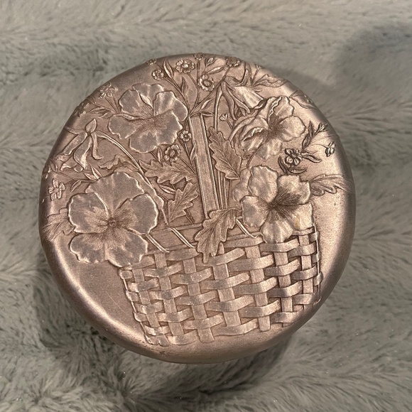 WENDELL AUGUST FORGE lidded container with basket of pansy design, 2.5" high, 3" circumference, handmade at forge at Grove City PA, gently worn pre-owned #7114