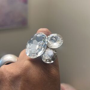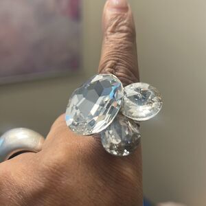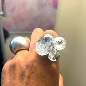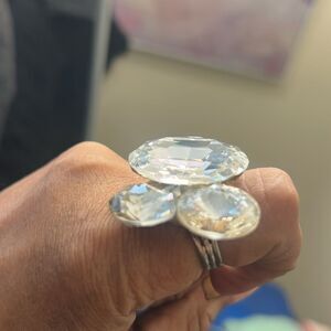 Make a bold statement with this stunning silver and clear crystal ring. Perfect for adding a touch of elegance to any outfit.