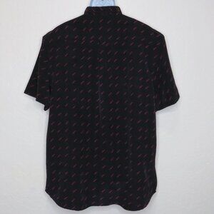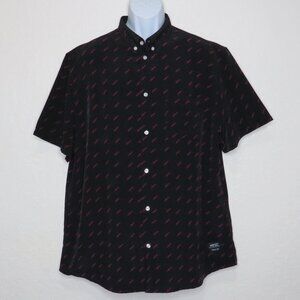 Pre-Owned Condition! 100% Polyester. Awesome Black Button Down Collar Chest Pocket with Dark Pink "Vibes" All Over Shirt. White Glossy Buttons, Very Soft and Lightweight. Unisex with Sizes Listed on Shirt.