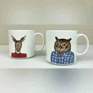 WEST ELM x Rachel Kozlowski Set of 2 Dapped Animals Mugs Barn Owl Deer Ceramic