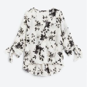 Beautiful and elegant black and white floral print. The functional ties on this blouse make it easy to adjust the neckline to your liking, and the tack at the bust keeps the blouse in place.